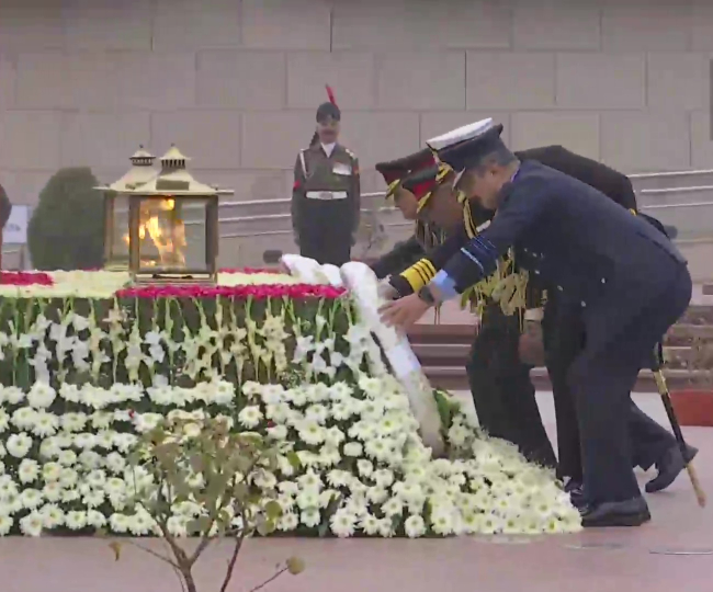 Delhi | CDS Gen Anil Chauhan and the three service chiefs - Army Chief General Manoj Pande, Air Force chief Air Chief Marshal VR Chaudhari and Navy Chief Admiral R Hari Kumar - lay wreaths at the National War Memorial on the occasion of Armed Forces Veterans Day. pic.twitter.com/DKRKglTzFq