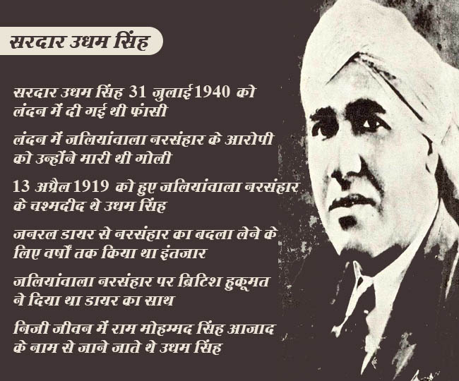 नई दिल्ली [जागरण स्पेशल]। सरदार उधम सिंह (26 दिसम्बर 1899 - 31 जुलाई 1940) भारत के स्वतन्त्रता संग्राम के महान सेनानी एवं क्रान्तिकारी थे। आज उनका शहीदी दिवस है। उन्होंने जलियांवाला बाग कांड के जघन्य नरसंहार को अंजाम देने वाले और पंजाब के तत्कालीन गर्वनर जनरल माइकल ओ डायर को लंदन में जाकर गोली मारी थी। कई इतिहासकारों का मानना है कि यह हत्याकांड ब्रिटिश अधिकारियों का एक सुनियोजित षड्यंत्र था, जो पंजाब पर नियंत्रण बनाए रखने और पंजाबियों को डराने के उद्देश्य से किया गया था। इतना ही नहीं जब इस नरसंहार के बाद पूरे देश में विरोध हुआ और भारतीय नेताओं ने इसकी निंदा की तब भी ब्रिटिश हुकूमत जनरल डायर के समर्थन से पीछे नहीं हटा।