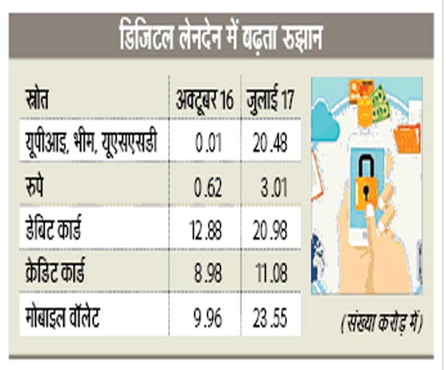 एक साल पहले जब नोटबंदी का एलान हुआ था, उससे पहले अक्टूबर 2016 में 70.21 करोड़ सौदे डिजिटल माध्यम से हुए थे। इनमें क्रेडिट-डेबिट कार्ड से होने वाले भुगतान के अलावा ऑनलाइन बैंकिंग के आंकड़े भी शामिल थे। सूचना प्रौद्योगिकी मंत्रालय के आंकड़ों के मुताबिक, करीब नौ महीने बाद जुलाई, 2017 तक डिजिटल लेनदेन की तादाद 113 करोड़ हो चुकी है। इस तरह डिजिटल लेनदेन में 60 फीसद की वृद्धि हुई।