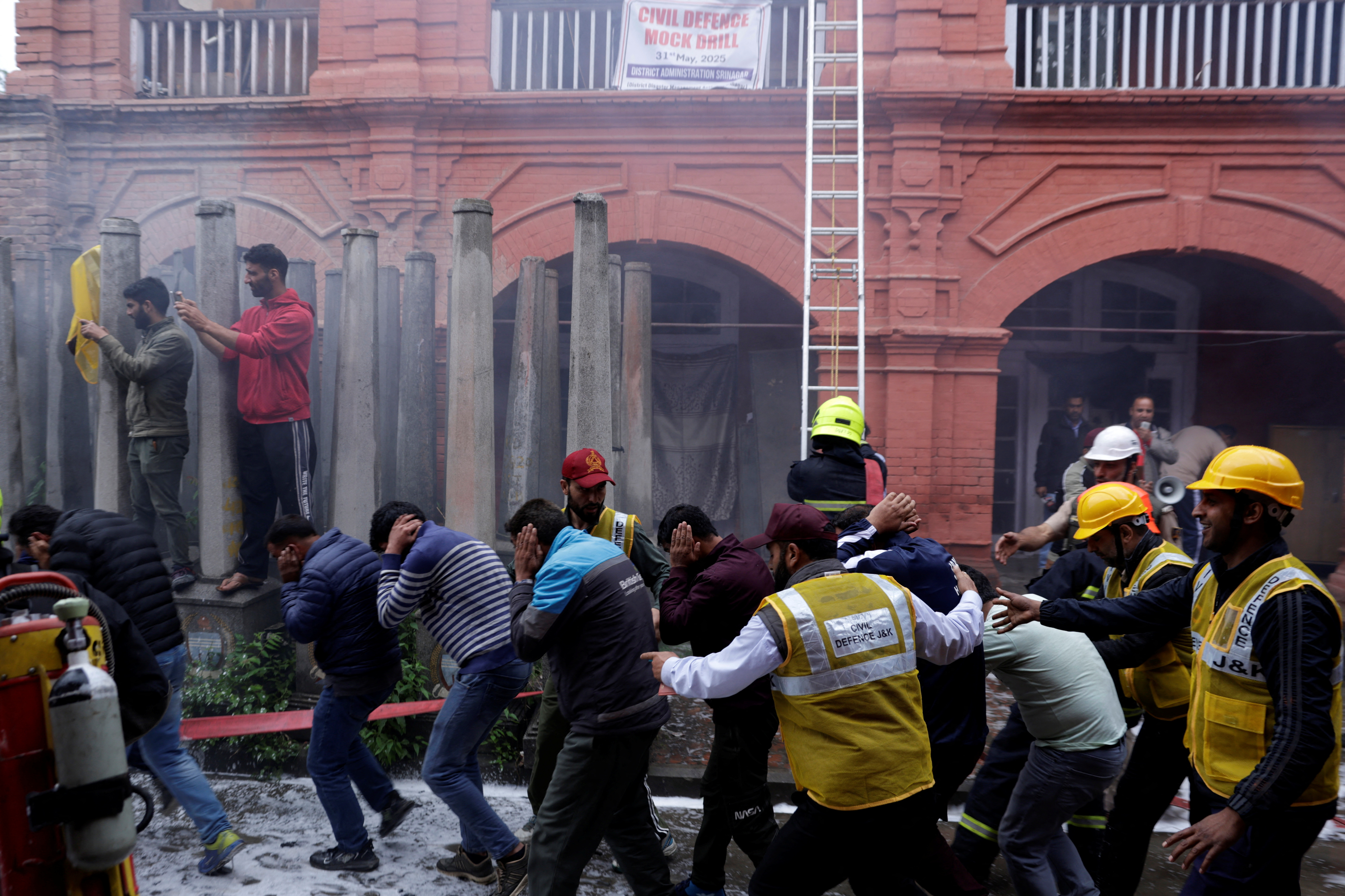 श्रीनगर में एक ऑफिस कॉम्प्लेक्स में सिविल डिफेंस मॉक ड्रिल का आयोजन हुआ। इस दौरान बचावकर्मी लोगों को सुरक्षित बाहर निकालते हुए दिखे।