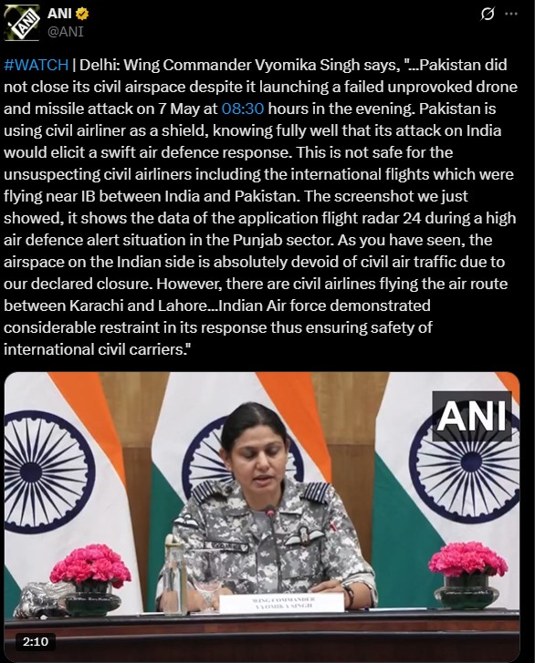 विंग कमांडर व्योमिका सिंह ने बताया कि पंजाब सेक्टर में हाई एयर डिफेंस अलर्ट था। हमारा एयरस्पेस सिविल फ्लाइट्स के लिए बंद है, लेकिन पाकिस्तान हवाई क्षेत्र में नागरिक उड़ान लगातार चल रही थी।