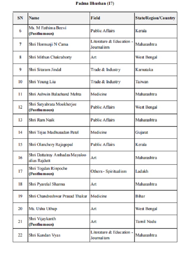उत्तर प्रदेश के पूर्व राज्यपाल राम नाईक, गायिका उषा उत्थुप, प्यारेलाल शर्मा सहित 17 हस्तियों को पद्म भूषण से सम्मानित किया जाएगा।