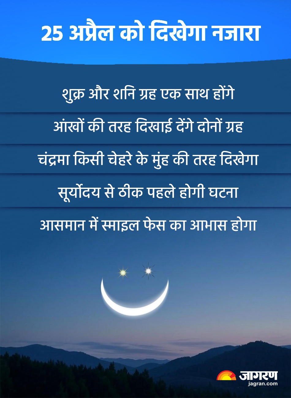 दरअसल 25 अप्रैल को एक रेयर परिस्थिति बन रही है, जब दो ग्रह और चांद आसमान में इस तरह मौजूद होंगे कि यह किसी स्माइल फेस की तरह दिखलाई देंगे। ये दोनों ग्रह शुक्र और शनि हैं। लाइवसाइंस की एक रिपोर्ट के अनुसार, ये खगोलीय घटना 25 अप्रैल की सुबह होगी।
