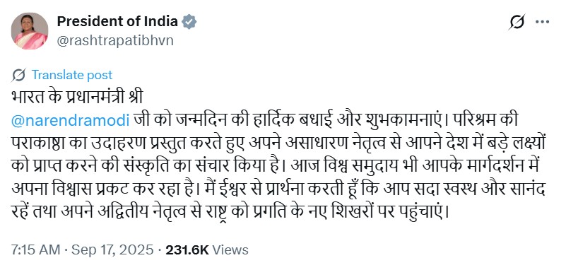 राष्ट्रपति द्रौपदी मुर्मू ने भी पीएम मोदी को जन्मदिन की बधाई दी है। सोशल मीडिया प्लेटफॉर्म एक्स पर पोस्ट शेयर करते हुए राष्ट्रपति मुर्मू ने लिखा, "परिश्रम की पराकाष्ठा का उदाहरण प्रस्तुत करते हुए अपने असाधारण नेतृत्व से आपने देश में बड़े लक्ष्यों को प्राप्त करने की संस्कृति का संचार किया है। आज विश्व समुदाय भी आपके मार्गदर्शन में अपना विश्वास प्रकट कर रहा है। मैं ईश्वर से प्रार्थना करती हूँ कि आप सदा स्वस्थ और सानंद रहें तथा अपने अद्वितीय नेतृत्व से राष्ट्र को प्रगति के नए शिखरों पर पहुंचाएं।"