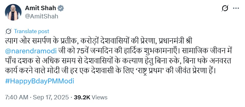 गृह मंत्री अमित शाह ने पीएम मोदी के जन्मदिन पर बधाई देते हुए कहा, "त्याग और समर्पण के प्रतीक, करोड़ों देशवासियों की प्रेरणा, प्रधानमंत्री श्री नरेंद्र मोदी जी को 75वें जन्मदिन की हार्दिक शुभकामनाएँ। सामाजिक जीवन में पाँच दशक से अधिक समय से देशवासियों के कल्याण हेतु बिना रुके, बिना थके अनवरत कार्य करने वाले मोदी जी हर एक देशवासी के लिए ‘राष्ट्र प्रथम’ की जीवंत प्रेरणा हैं।"