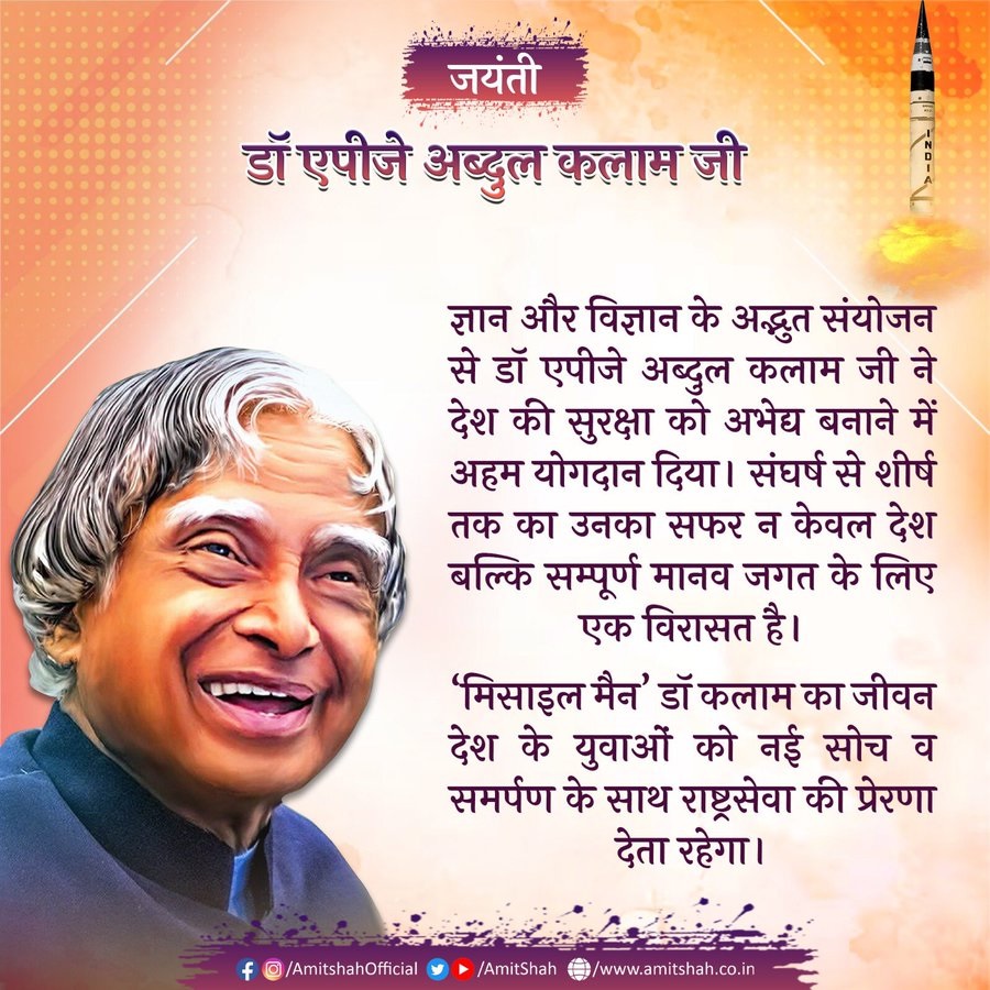 अमित शाह ने आगे लिखा," ‘मिसाइल मैन’ डॉ कलाम का जीवन देश के युवाओं को नई सोच व समर्पण के साथ राष्ट्र सेवा की प्रेरणा देता रहेगा। पूर्व राष्ट्रपति भारत रत्न डॉ एपीजे अब्दुल कलाम जी की जयंती पर उन्हें नमन।"