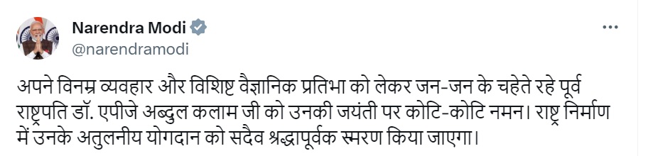 पीएम मोदी ने सोशल मीडिया प्लेटफॉर्म X पर लिखा,"अपने विनम्र व्यवहार और विशिष्ट वैज्ञानिक प्रतिभा को लेकर जन-जन के चहेते रहे पूर्व राष्ट्रपति डॉ. एपीजे अब्दुल कलाम जी को उनकी जयंती पर कोटि-कोटि नमन। राष्ट्र निर्माण में उनके अतुलनीय योगदान को सदैव श्रद्धा पूर्वक स्मरण किया जाएगा।"