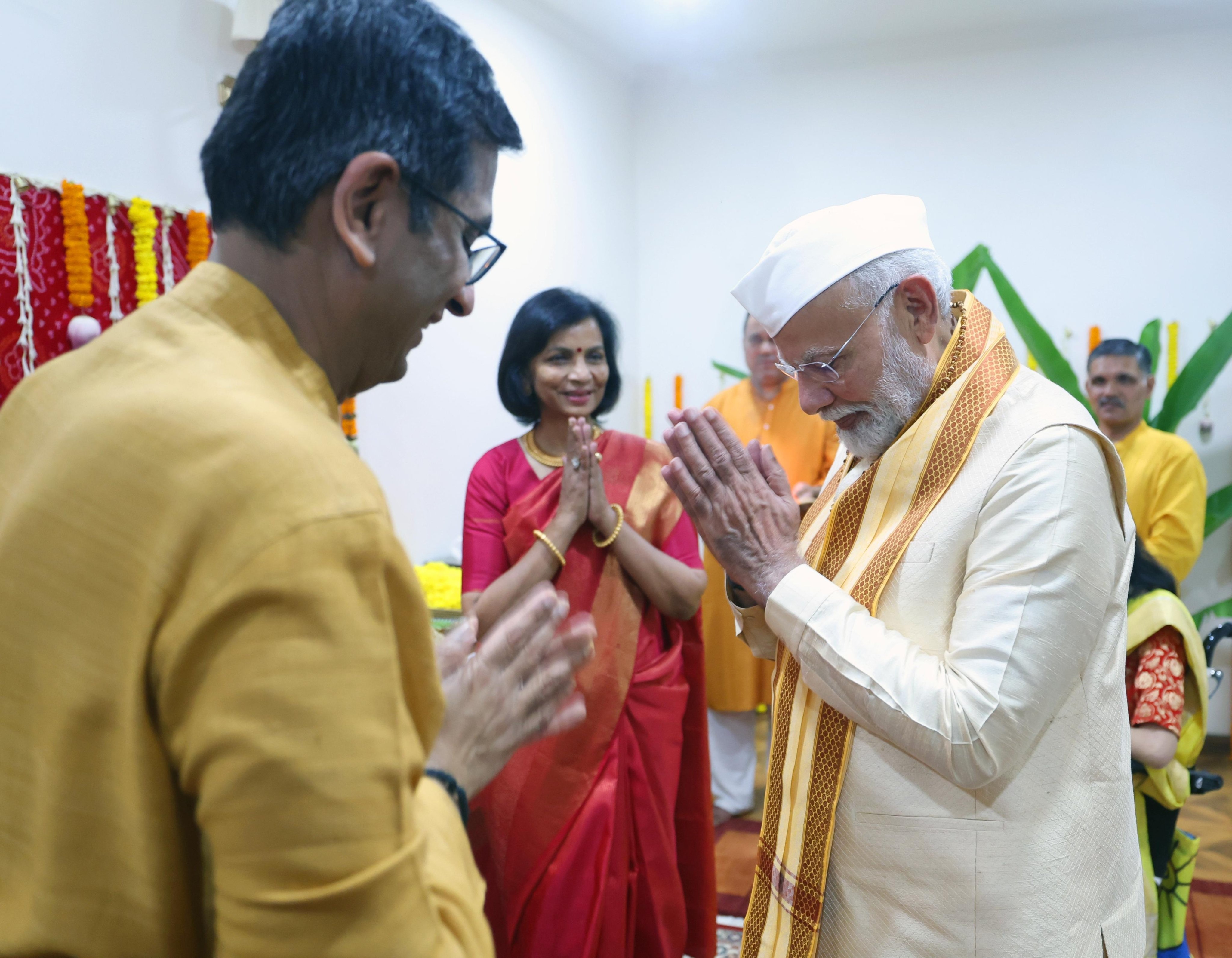 प्रधानमंत्री नरेंद्र मोदी ने दिल्ली में भारत के मुख्य न्यायाधीश डी.वाई. चंद्रचूड़ के आवास पर गणेश पूजा समारोह में भाग लिया। पीएम मोदी जब मुख्य न्यायाधीश चंद्रचूड़ के घर पहुंचे तो उनका स्वागत सीजेआई और उनकी पत्नी ने किया। इस दौरान पीएम मोदी ने मराठी अंदाज में सफेद टोपी पहनी हुई थी। इसके बाद पीएम मोदी ने सीजेआई और उनकी पत्नी के साथ भगवान गणेश की पूजा की।