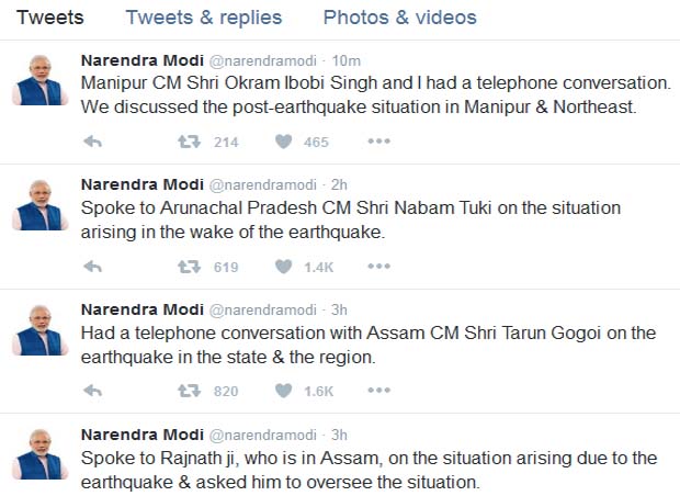 मोदी ने भूकंक के बाद ट्वीट कर इस बात की जानकारी दी। उन्होंने ये भी कहा कि वे असम के दौरे पर गए गृहमंत्री राजनाथ सिंह से भी संपर्क में हैं और भूकंप से जुड़े हालात की पल-पल की खबर ले रहे हैं। इस दौरान प्रधानमंत्री नरेंद्र मोदी ने अरूणाचल प्रदेश के मुख्यमंत्री नबाम तुकी से भी फोन पर बातचीत की और वहां के हालात की जानकारी ली।