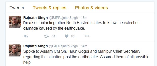 दिल्ली के मुख्यमंत्री अरविंद केजरीवाल ने भी भूकंप के बाद ट्वीट किया। Two NDRF teams comprising 90 members have been rushed to Imphal from Guwahati #Earthquake