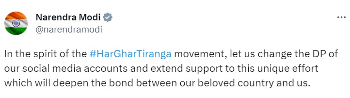 पीएम मोदी ने रविवार को ट्वीट करते हुए कहा कि हर घर तिरंगा आंदोलन का हिस्सा बनते हुए हम सब देशवासी अपने सोशल मीडिया अकाउंट की डीपी (डिस्प्ले पिक्चर) बदलें। इस कदम से देश की एकता और अखंडता को और मजबूती मिलेगी।