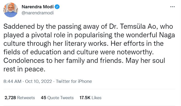 पीएम मोदी ने दुख व्यक्त करते हुए ट्वीट कर कहा, 'डॉक्टर तेम्सुला आओ के निधन से दुखी हूं, जिन्होंने अपने साहित्यिक कार्यों के माध्यम से अद्भुत नगा संस्कृति को लोकप्रिय बनाने में महत्वपूर्ण भूमिका निभाई। शिक्षा और संस्कृति के क्षेत्र में उनके प्रयास उल्लेखनीय थे। उनके परिवार और दोस्तों के प्रति मेरी गहरी संवेदना है। उनकी आत्मा को शांति मिली।'