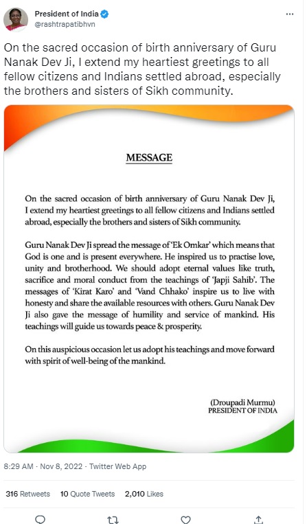पीएम मोदी के अलावा राष्ट्रपति द्रौपदी मुर्मू ने भी गुरु नानक देव की जयंती के पावन अवसर पर हार्दिक बधाई दी। उन्होंने ट्वीट किया "गुरु नानक देव जी की जयंती के पावन अवसर पर, मैं विदेशों में बसे सभी देशवासियों और भारतीयों, विशेषकर सिख समुदाय के भाइयों और बहनों को हार्दिक बधाई देती हूं"।