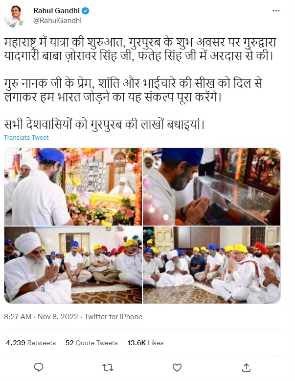 कांग्रेस के पूर्व अध्यक्ष व मौजूदा सांसद राहुल गांधी ने भी गुरुपर्व के मौके पर देशवासियों को बधाई दी। राहुल ने ट्वीट किया, "महाराष्ट्र में यात्रा की शुरुआत, गुरपुरब के शुभ अवसर पर गुरुद्वारा यादगारी बाबा जोरावर सिंह जी, फतेह सिंह जी में अरदास से की। गुरु नानक जी के प्रेम, शांति और भाईचारे की सीख को दिल से लगाकर हम भारत जोड़ने का यह संकल्प पूरा करेंगे। सभी देशवासियों को गुरपुरब की लाखों बधाइयां।"