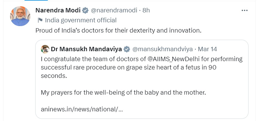 मनसुख मंडाविया ने ट्वीट किया, 'मैं @AIIMS_NewDelhi के डॉक्टरों की टीम को 90 सेकंड में एक भ्रूण के अंगूर के आकार के दिल पर सफल दुर्लभ प्रक्रिया करने के लिए बधाई देता हूं। बच्चे और मां की सलामती के लिए मेरी प्रार्थना।'