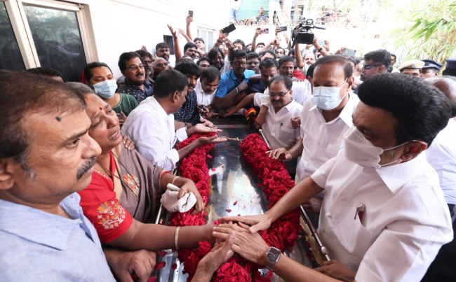 सीएम स्टालिन विजयकांत के चेन्नई स्थित आवास पर उन्हें अंतिम विदाई देने पहुंचे हैं।