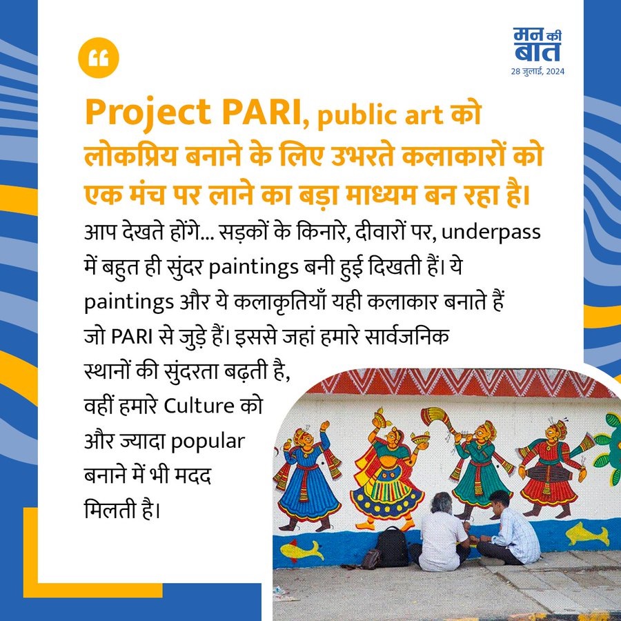 प्रधानमंत्री ने इस दौरान प्रोजेक्ट परी के बारे में भी बात की। पीएम मोदी ने बताया कि इस प्रोजेक्ट के जरिए सार्वजनिक कला को बढ़ावा दिया जा रहा है। दरअसल, प्रोजेक्ट परी उभरते कलाकारों को एक मंच पर लाकर सार्वजनिक कला को लोकप्रिय बनाने का एक बड़ा माध्यम बन रहा है।