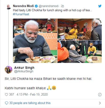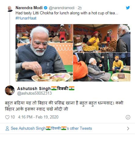अंकुर सिंह नाम के एक ट्विटर यूजर ने मोदी के ट्वीट को रिट्वीट करते हुए लिखा कि पीएम मोदी को न्योता देते लिखा, 'सर, लिट्टी चोखा खाने का मजा बिहारी के साथ है। कभी हमारे साथ खाइए।'