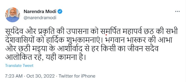 Chhath Puja 2022: प्रधानमंत्री मोदी ने देशवासियों को दी छठ पर्व की शुभकामनाएं, कहा- आलोकित रहे हर किसी का जीवन