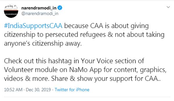 प्रधानमंत्री नरेंद्र मोदी ने #IndiaSupportsCAA ट्वीट करते हुए लिखा- क्योंकि सीएए प्रताड़ित शरणार्थियों को नागरिकता देता है और यह किसी की नागरिकता छीनता नहीं है। नमो ऐप के वॉलिंटियर मॉड्यूल के वाइस सेक्शन में मजेदार कंटेंट, ग्रॉफिक्स और अन्य को देखने के लिए इस हैशटैग को देखें। पीएम ने अपने ट्वीट में लिखा है कि इस हैशटैग के जरिए सीएए के पक्ष में अपना समर्थन दें।