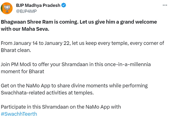 बीजेपी की एमपी यूनिट ने एक्स पर लिखा- 'भगवान श्री राम आ रहे हैं, आइए हम अपनी महासेवा के साथ उनका भव्य स्वागत करें। 14 जनवरी से 22 जनवरी तक हम भारत के हर मंदिर, हर कोने को स्वच्छ रखें। भारत के लिए सहस्राब्दी में एक बार आने वाले इस क्षण में अपना श्रमदान देने के लिए पीएम मोदी से NaMo ऐप पर जुड़ें।'
