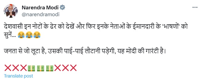 पीएम ने अपनी पोस्ट में लिखा है, 'देशवासी इन नोटों के ढेर को देखें और फिर इनके नेताओं के ईमानदारी के 'भाषणों' को सुनें। जनता से जो लूटा है, उसकी पाई-पाई लौटानी पड़ेगी, यह मोदी की गारंटी है।' पीएम ने ये भी लिखा कि नोटों के ढेर को देखें और फिर इनके नेताओं के ईमानदारी के 'भाषणों' को सुनें।