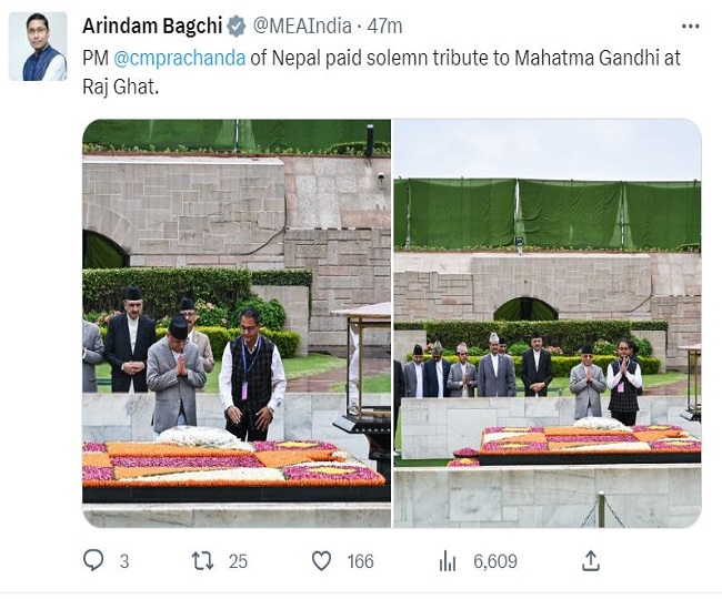 विदेश मंत्रालय के आधिकारिक प्रवक्ता अरिंदम बागची ने ट्वीट किया, "नेपाल के प्रधानमंत्री @cmprachanda ने राजघाट पर महात्मा गांधी को श्रद्धांजलि अर्पित की।"