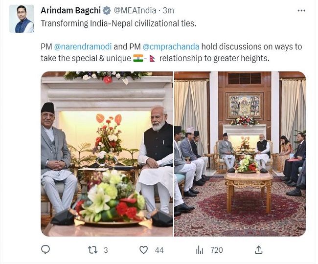 विदेश मंत्रालय के प्रवक्ता अरिंदम बागची ने ट्वीट किया, "दोस्ती और सहयोग के बंधन को गहराते हुए। पीएम @narendramodi ने नेपाल के पीएम @cmprachanda को द्विपक्षीय वार्ता के लिए हैदराबाद हाउस पहुंचने पर बधाई दी।"