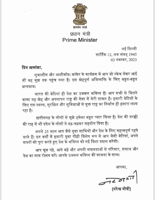 पीएम मोदी ने आकांक्षा को लिखे पत्र में कहा, ''छत्तीसगढ़ के लोगों से मुझे हमेशा बहुत प्यार मिला है. राज्य के लोगों ने भी देश की प्रगति की राह में बढ़-चढ़कर योगदान दिया है।''
