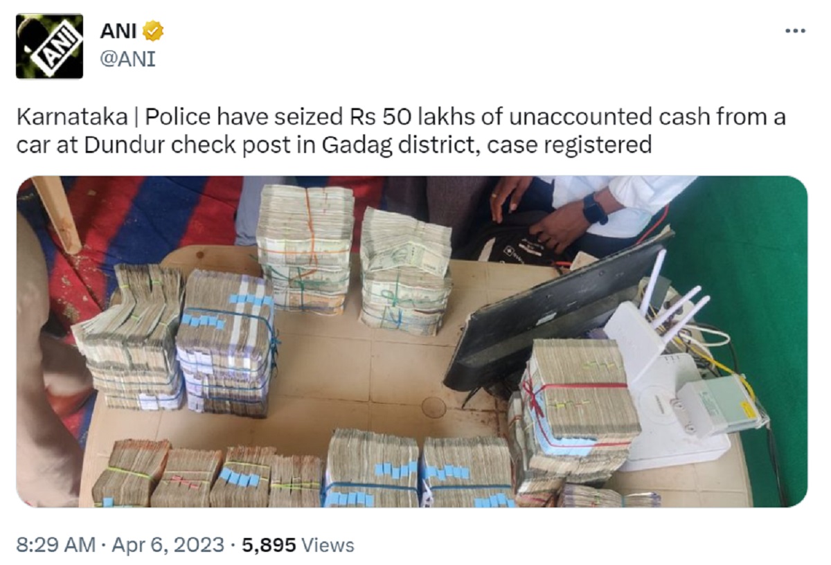 प्रदेश में बीते कुछ दिनों से कैश बरामद होने के मामले सामने आ रहे हैं। कर्नाटक पुलिस ने एक बार फिर बड़ी संख्या में नकदी जब्द की है। पुलिस गडग जिले के डुंडुर चेक पोस्ट पर वाहनों की चेकिंग कर रही थी। चेकिंग के दौरान एक गाड़ी से बड़ी संख्या में कैश मिला है। पुलिस ने बताया कि एक कार से 50 लाख रुपये बरामद किए गए हैं। 50 लाख रुपये किसके हैं, इसका जानकारी नहीं मिल सकी है।