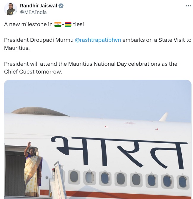 राष्ट्रपति भवन ने एक्स पर एक पोस्ट में कहा, 'राष्ट्रपति द्रौपदी मुर्मु मॉरीशस की अपनी पहली राजकीय यात्रा के लिए रवाना हो गई हैं। वह मॉरीशस के राष्ट्रीय दिवस समारोह में मुख्य अतिथि के रूप में शामिल होंगी।'