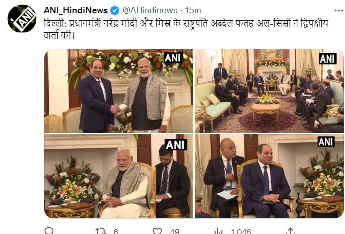 वहीं विदेश मंत्री डॉ एस जयशंकर ने मिस्र के राष्ट्रपति अब्देल फतह अल-सिसी से मुलाकात की। मिस्र के राष्ट्रपति मुख्य अतिथि के रूप में गणतंत्र दिवस परेड 2023 में शामिल होंगे।