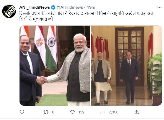 Republic Dayराष्ट्रपति द्रौपदी मुर्मू प्रधानमंत्री नरेंद्र मोदी ने राष्ट्रपति भवन में मिस्र के राष्ट्रपति अब्देल फतह अल-सिसी का स्वागत किया। मिस्र के राष्ट्रपति अब्दुल फतेह अल-सिसी आज द्विपक्षीय वार्ता के लिए प्रधानमंत्री नरेन्द्र मोदी से हैदराबाद हाउस में मुलाकात करेंगे। वह दोनों देशों के बीच कारोबार करने की पेशकश करेंगे।