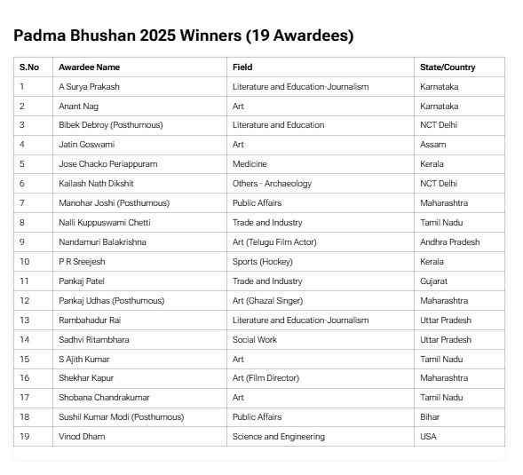 पद्म विभूषण (7 पुरस्कार) 2025 विजेता