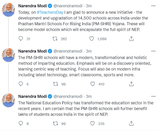 प्रधानमंत्री मोदी ने ट्वीट कर कहा- आज शिक्षक दिवस (Teachers Day) पर मुझे एक नई पहल की घोषणा करते हुए बेहद खुशी हो रही है। प्रधानमंत्री स्कूल फॉर राइजिंग इंडिया (PM-SHRI) योजना के तहत देशभर में 14,500 स्कूलों को अपग्रेड किया जाएगा जिससे ये मॉडल स्कूल बन जाएंगे और नई शिक्षा नीति की पूरी भावना को समाहित करेंगे। पीएम-श्री स्कूलों में शिक्षा प्रदान करने का तरीका आधुनिक, परिवर्तनकारी और समग्र होगा। इसके तहत डिस्कवरी और शिक्षण केंद्रित लर्निंग पर जोर दिया जाएगा।