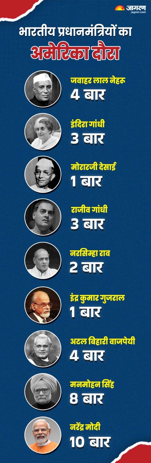इनके अलावा जवाहर लाल नेहरू और अटल बिहारी वाजपेयी ने 4-4 बार, इंदिरा गांधी और राजीव गांधी ने 3-3 बार, पीवी नरसिम्हा राव ने 2 बार, मोरारजी देसाई और इंद्र कुमार गुजराल ने 1-1 बार अमेरिका की यात्रा की है। जवाहर लाल नेहरू और इंदिरा गांधी के बाद मोदी तीसरे ऐसे भारतीय पीएम होंगे, जिनका तीन अलग-अलग अमेरिकी राष्ट्रपतियों ने दौरे पर स्वागत किया है।