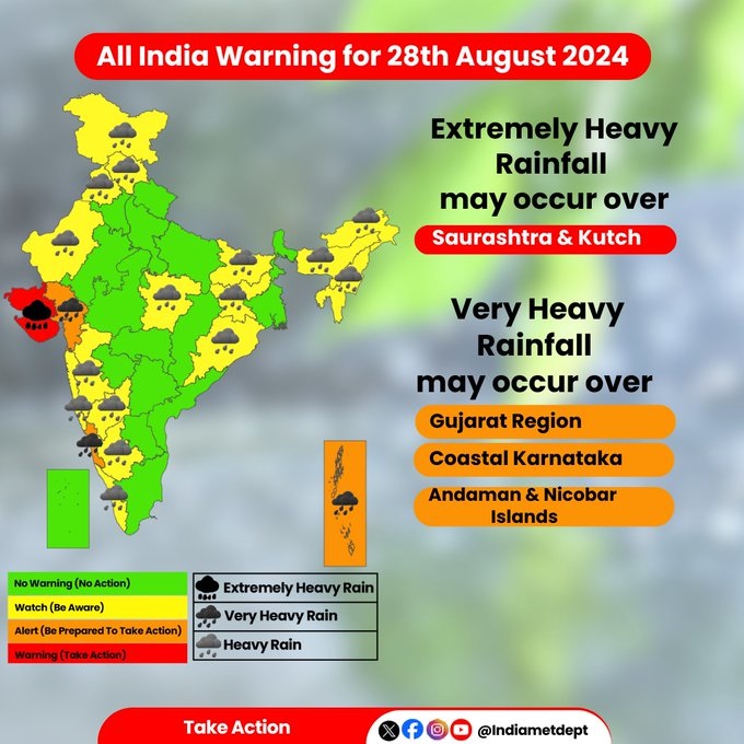 आईएमडी ने कहा कि सौराष्ट्र और कच्छ में 30 अगस्त तक अत्यधिक भारी बारिश की संभावना है। दक्षिण गुजरात में 31 अगस्त तक भारी बारिश की संभावना है।