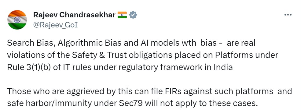 इलेक्ट्रॉनिक्स व आईटी राज्य मंत्री राजीव चंद्रशेखर ने कहा है कि अगर किसी टेक प्लेटफार्म का AI मॉडल उसका सर्च और एल्गोरिदम पक्षपातपूर्ण है तो उस प्लेटफार्म के खिलाफ मुकदमा दर्ज हो सकता है।उन्होंने कहा है कि अगर किसी प्लेटफार्म का एआई पक्षपातपूर्ण रवैया अपनाता है तो ऐसे प्लेटफार्म को सेक्शन 79 के तहत कोई सुरक्षा नहीं मिलेगी और आहत व्यक्ति उस प्लेटफार्म के खिलाफ एफआईआर दर्ज करा सकता है।