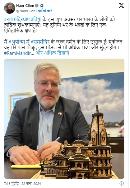 प्राण-प्रतिष्ठा के मौके पर भारत में इजरायल के राजदूत नाओर गिलोन ने कहा,"राम मंदिर प्राण प्रतिष्ठा के इस शुभ अवसर पर भारत के लोगों को हार्दिक शुभकामनाएं। यह दुनिया भर के भक्तों के लिए एक ऐतिहासिक क्षण है। मैं अयोध्या में राम मंदिर के जल्द दर्शन के लिए उत्सुक हूं। यकीनन, वह मेरे पास मौजूद इस मॉडल से भी अधिक भव्य और सुंदर होगा।"