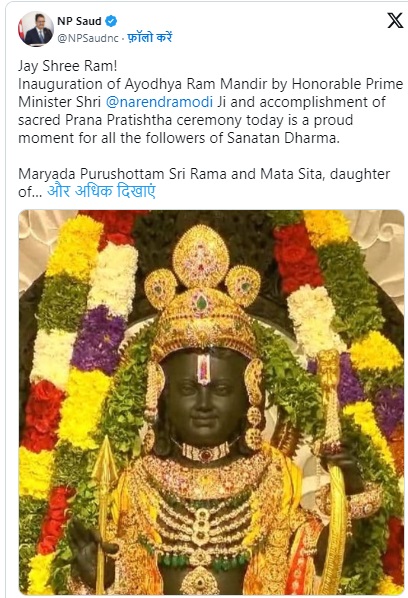 सबसे पहले भगवान राम के ससुराल नेपाल की बात करते हैं। नेपाल के विदेश मंत्री एनपी सऊदी ने प्राण-प्रतिष्ठा के मौके पर अपनी प्रतिक्रिया साझा की। उन्होंने सोशल मीडिया प्लेटफॉर्म एक्स पर लिखा, जय श्रीराम। भारत के माननीय प्रधानमंत्री नरेंद्र मोदी द्वारा श्री राम मंदिर का उद्घाटन एवं आज प्राण प्रतिष्ठा समारोह का संपन्न होना सनातन धर्म के सभी अनुयायियों के लिए गौरव का पल है।