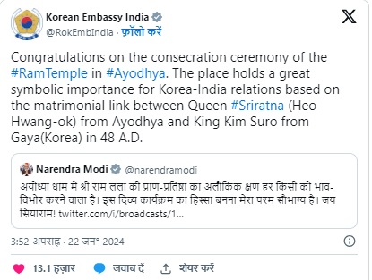 भारत में मौजूद दक्षिण कोरियाई दूतावास ने भी प्राण-प्रतिष्ठा के मौके पर खुशी जाहिर की। दक्षिण कोरियाई दूतावास की ओर से संदेश साझा करते हुए लिखा गया,"अयोध्या में राम मंदिर के प्राण प्रतिष्ठा के समारोह पर बधाई। यह ऐतिहासिक जगह 48 ई. से ही अयोध्या की रानी श्रीरत्ना (हीओ ह्वांग-ओके) और गया (कोरिया) के राजा किम सुरो के बीच वैवाहिक संबंध के आधार पर भारत-कोरिया संबंधों के लिए एक महत्वपूर्ण प्रतीकात्मक महत्व रखता है।"