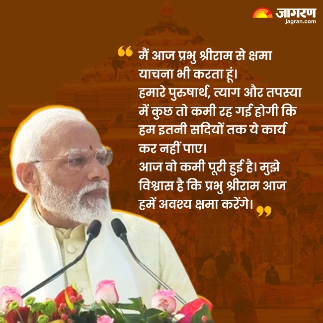प्रधानमंत्री मोदी ने कहा कि मैं आज प्रभु श्रीराम से क्षमा याचना भी करता हूं। हमारे पुरुषार्थ, त्याग और तपस्या में कुछ तो कमी रह गई होगी कि हम इतनी सदियों तक ये कार्य कर नहीं पाए। आज वो कमी पूरी हुई है। मुझे विश्वास है कि प्रभु राम आज हमें अवश्य क्षमा करेंगे। भारत के संविधान की पहली प्रति में भगवान राम विराजमान हैं। संविधान के अस्तित्व में आने के बाद भी दशकों तक प्रभु श्रीराम के अस्तित्व को लेकर कानूनी लड़ाई चली। मैं आभार व्यक्त करूंगा भारत की न्यायपालिका का, जिसने न्याय की लाज रख ली। न्याय के पर्याय प्रभु राम का मंदिर भी न्यायबद्ध…