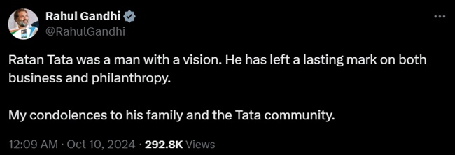 लोकसभा में विपक्ष के नेता राहुल गांधी ने कहा कि वह एक दूरदर्शी व्यक्ति थे, जिन्होंने व्यापार और परोपकार दोनों पर अमिट छाप छोड़ी है। कांग्रेस अध्यक्ष मल्लिकार्जुन खड़गे ने भी टाटा के निधन पर दुख व्यक्त करते हुए कहा कि उनके निधन से हमने भारत का एक अमूल्य पुत्र खो दिया है।