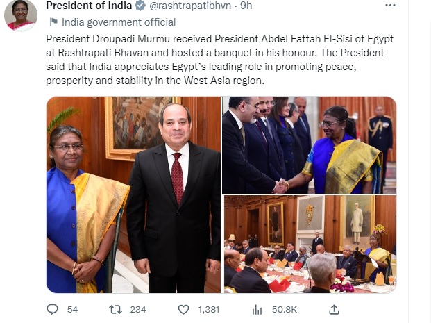 74वें गणतंत्र दिवस के मुख्य अतिथि मिस्त्र के राष्ट्रपति अब्दुल फतह अल-सीसी है। आज उनका राष्ट्रपति भवन में पारंपरिक तरीके से स्वागत किया गया। विदेश मंत्रालय के प्रवक्ता बागची ने ट्वीट कर जानकारी दी कि राष्ट्रपति द्रौपदी मुर्मू ने राष्ट्रपति भवन में मिस्र के राष्ट्रपति अल सीसी का पारंपरिक स्वागत किया है। बता दें कि मिस्त्र के राष्ट्रपति के साथ एक उच्च स्तरीय प्रतिनिधिमंडल भी आया है। यह पहला मौका है जब मिस्र के राष्ट्रपति को गणतंत्र दिवस समारोह में मुख्य अतिथि के तौर पर आमंत्रित किया गया है।
