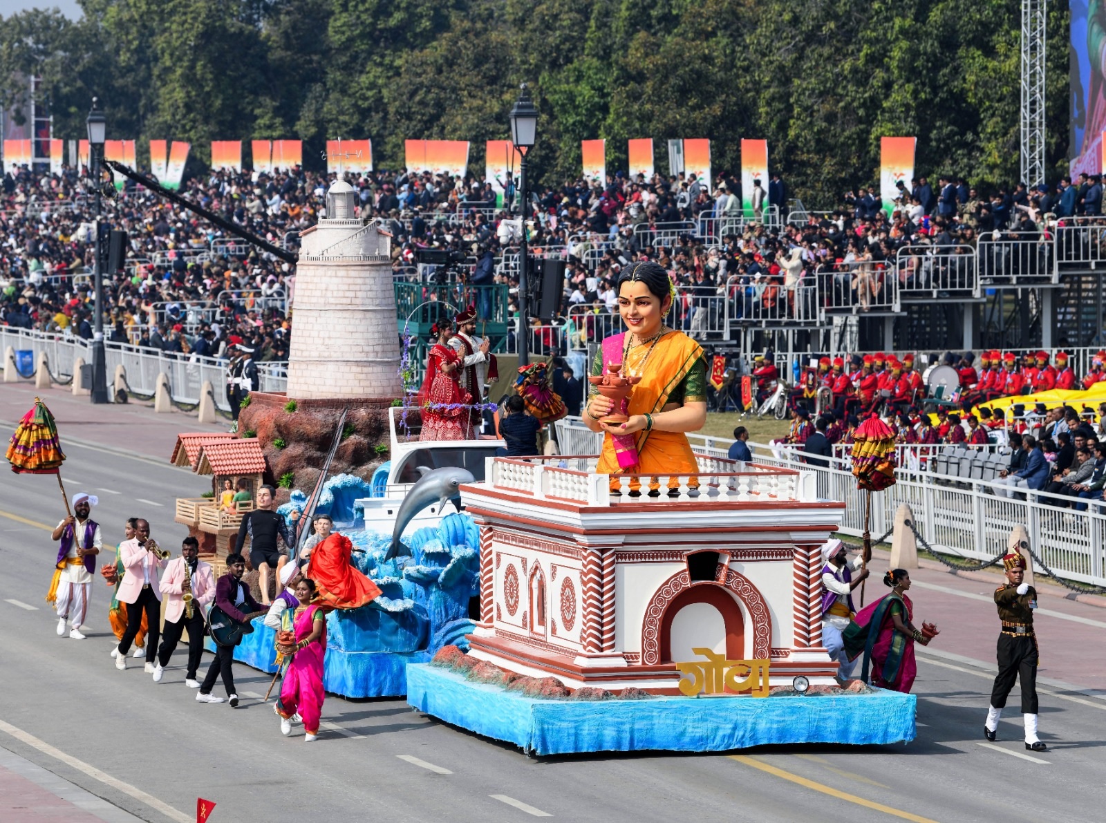 - गोवा की झांकी का थीम 'स्वर्णिम भारत: विरासत और विकास' था, जिसमें राज्य के प्राचीन समुद्र तटों, हरे-भरे परिदृश्यों और समृद्ध संस्कृति का जश्न मनाती है। गोवा अपने समुद्र तटों के लिए जाना जाता है, इसलिए इसकी झांकी में जल क्रीड़ाओं पर प्रकाश डाला गया, जो गोवा के पर्यटन में महत्वपूर्ण भूमिका निभाते हैं।