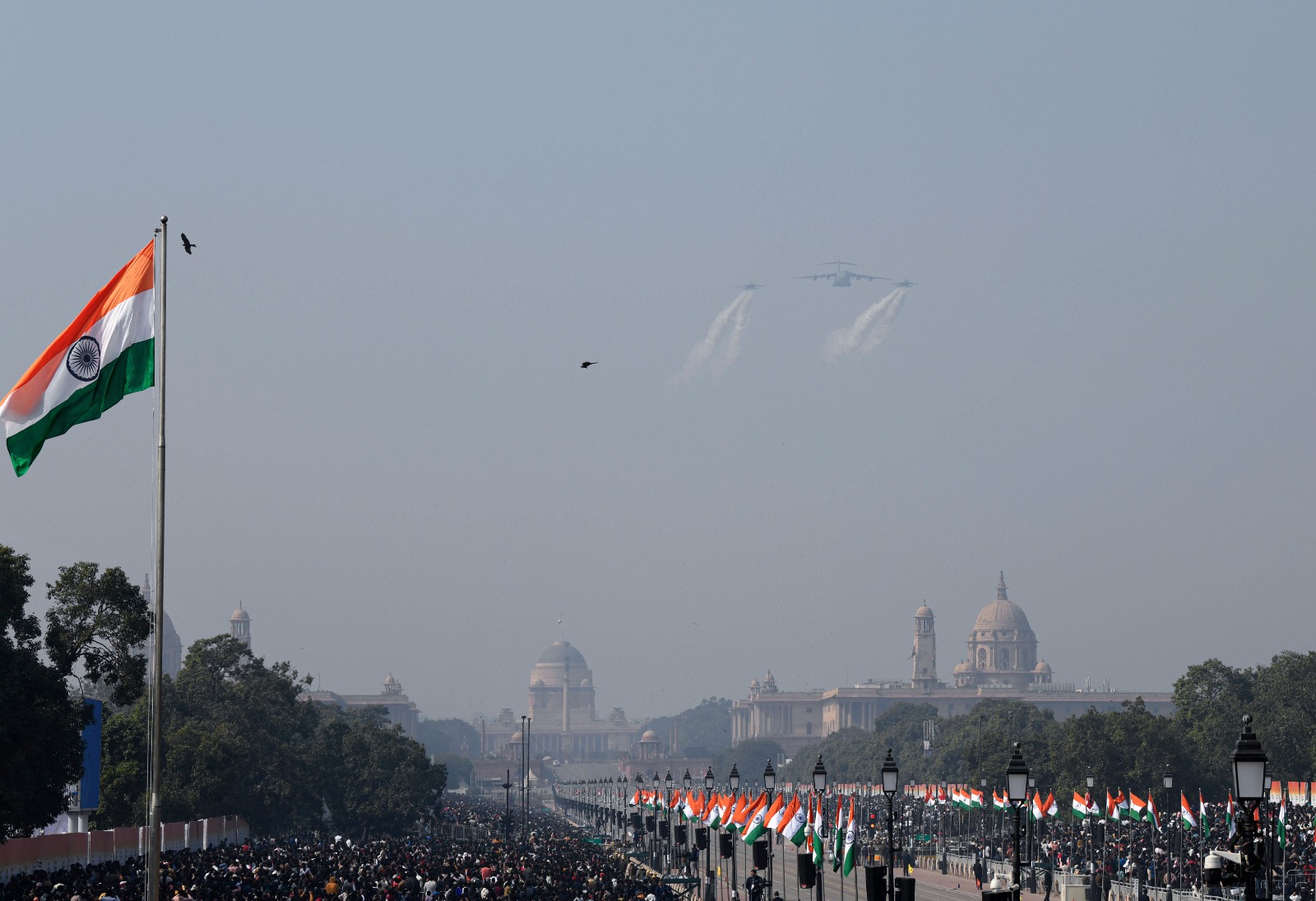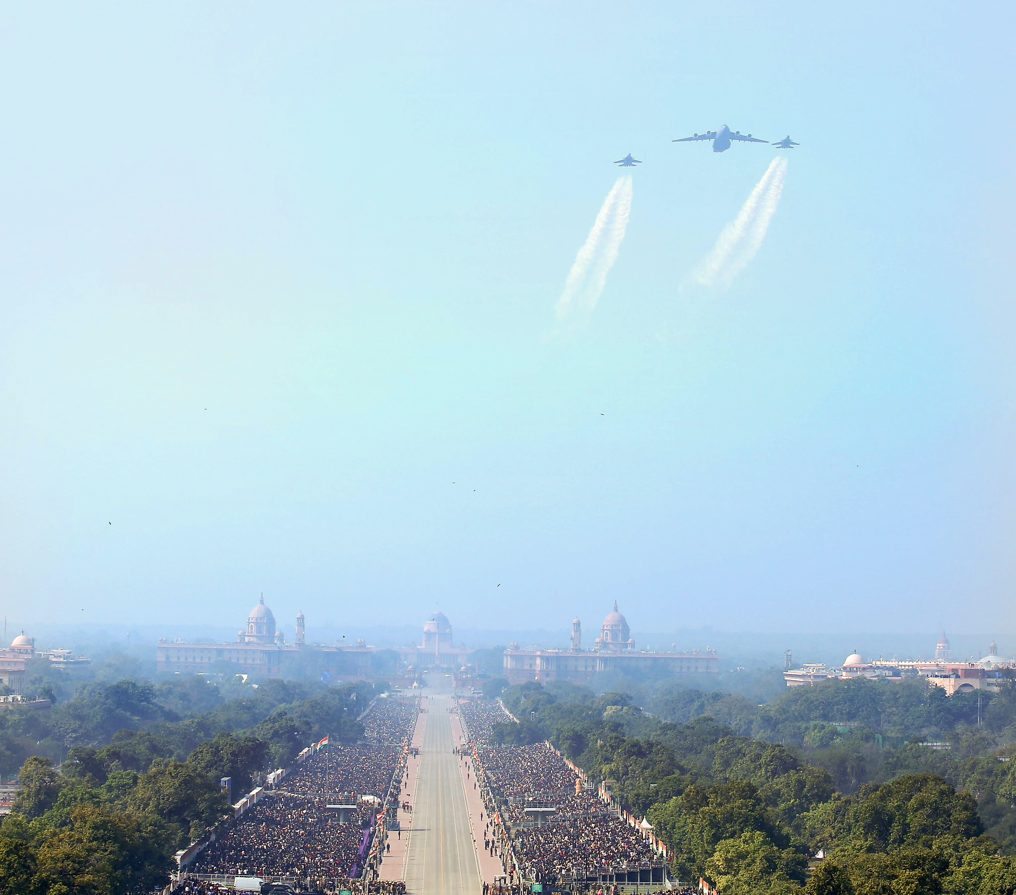 परेड के आखिर में वायुसेना के लड़ाकू हेलीकॉप्टरों और विमानों के कौशल अजेय, अमृत, अर्जन, बाज, भीम, ध्वज, रक्षक, सतलज, त्रिशुल, वाजरंग, विजय और वरूणा फार्मेशन ने कर्तव्य पथ के आकाश को भारतीय वायुसेना के रणकौशल का जैसे आईना बना दिया।