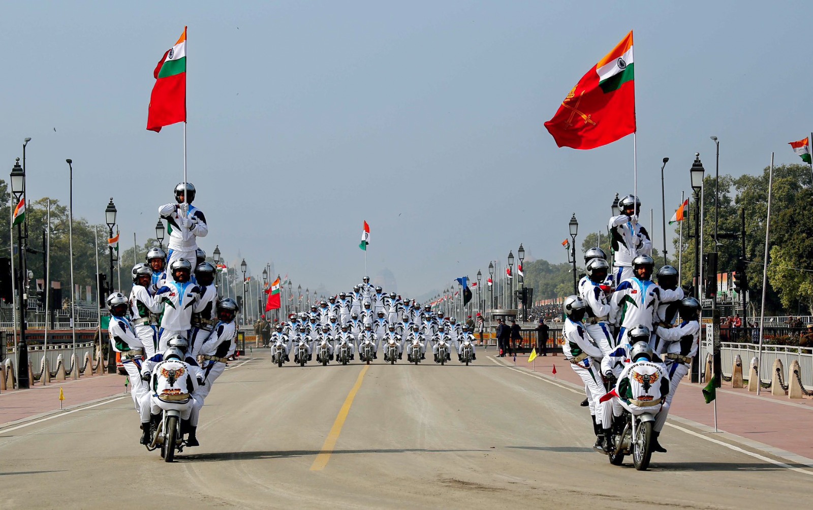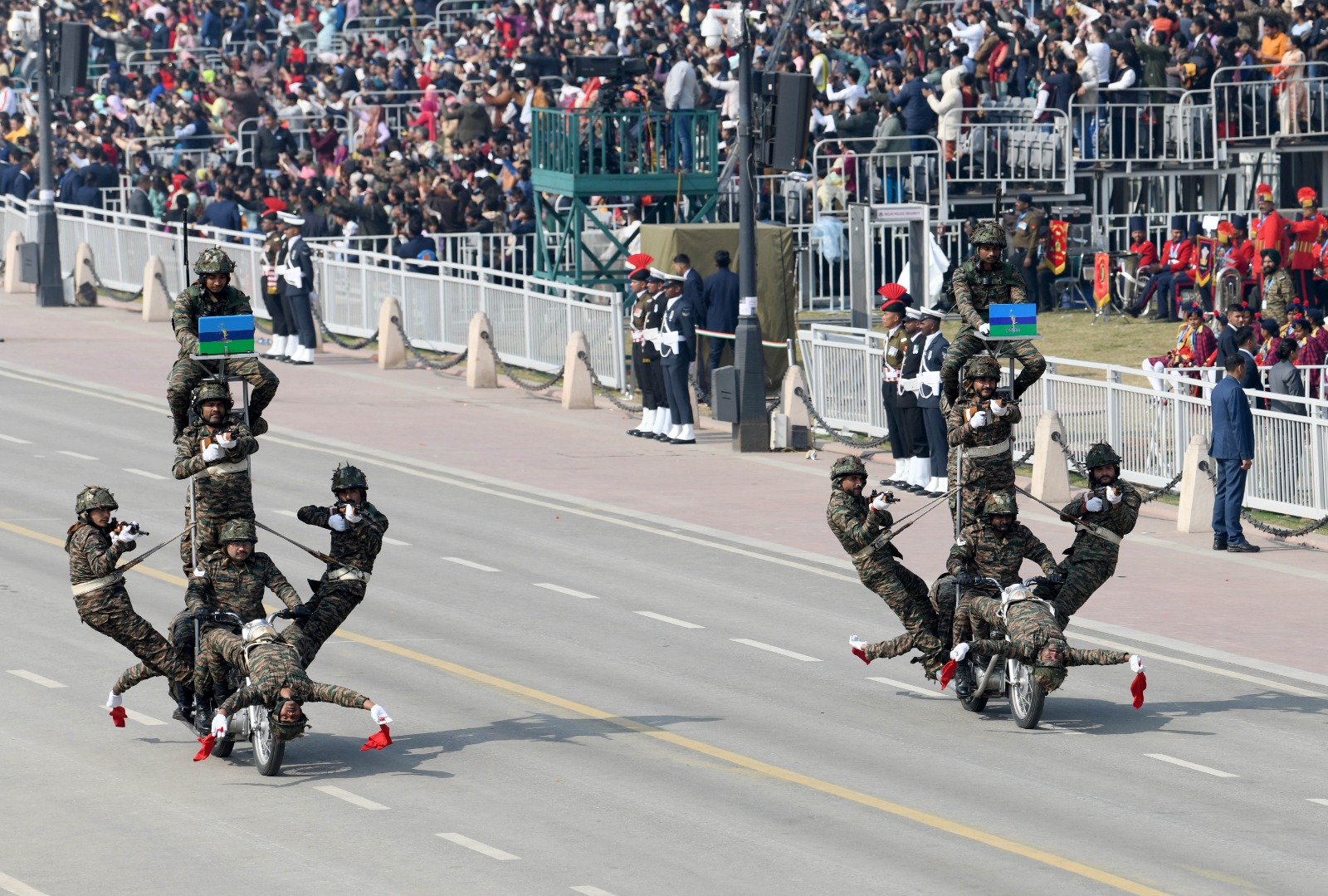 इसके बाद कैप्टन डिंपल सिंह भाटी ने चलती मोटरसाइकिल पर 12 फुट की सीढ़ी पर सवार होकर राष्ट्रपति को सलामी देने वाली पहली महिला सेना अधिकारी का न केवल विश्व रिकॉर्ड बनाया बल्कि दर्शकों की सांसें थाम ली।