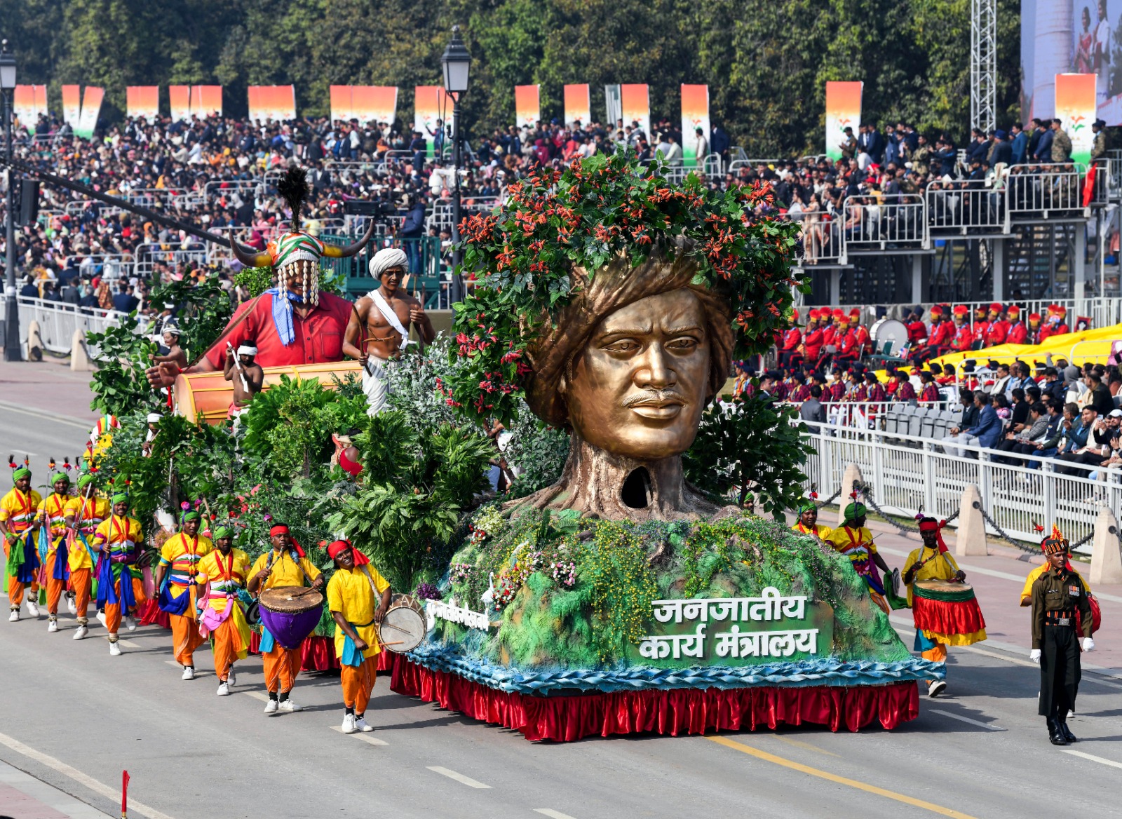 खास बात यह रही कि कि 1950 में भारत के प्रथम गणतंत्र दिवस समारोह में भी इंडोनेशिया के पहले राष्ट्रपति सुकर्णो ही समारोह में मुख्य अतिथि थे। राष्ट्रध्वज फहराए जाने के बाद इस बार संगीत नाटक अकादमी की ओर से विशेष सांस्कृतिक प्रदर्शन 'जयति जया मम: भारतम्'' का प्रदर्शन किया गया। इसमें आदिवासी महानायक बिरसा मुंडा को श्रद्धांजलि देते हुए देश की आदिवासी और लोक शैलियों की समृद्ध विरासत को जीवंत किया गया।