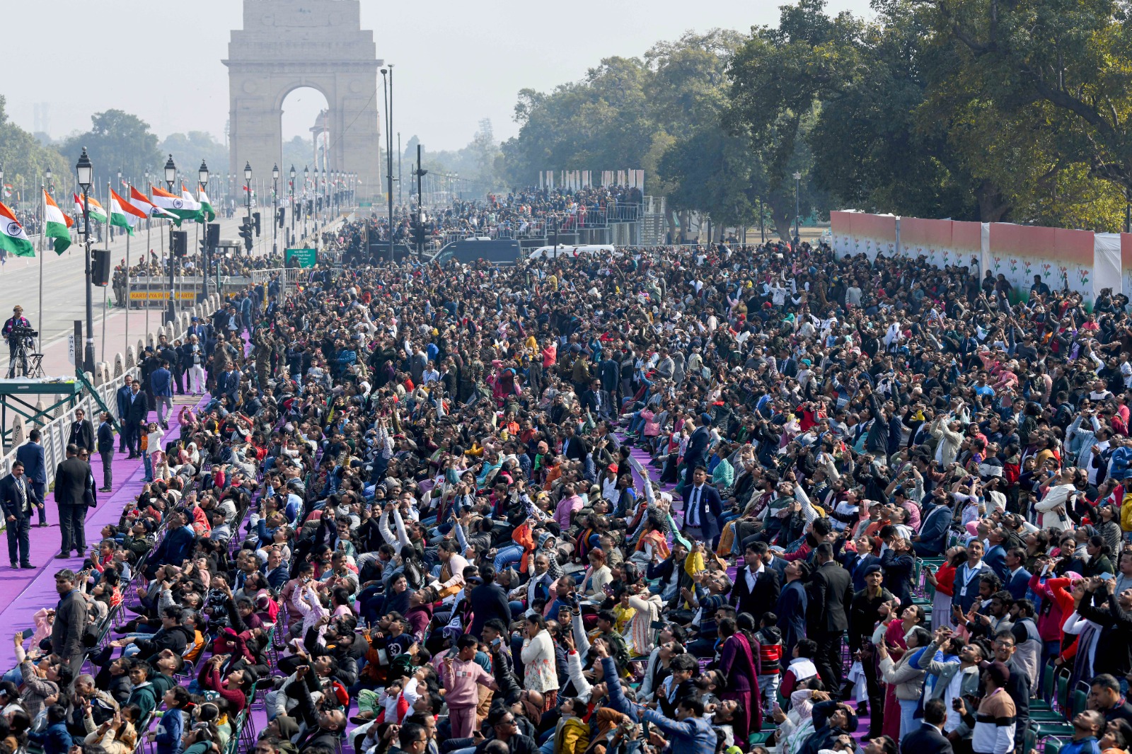 रक्षामंत्री राजनाथ सिंह ने परेड स्थल पर पहुंचे पीएम मोदी की अगवानी की। राष्ट्रपति द्रौपदी मुर्मू तथा इंडोनेशियाई राष्ट्रपित सुबियांतो राष्ट्रपति की अश्व बग्गी में सवार होकर कर्तव्य पथ पहुंचे जहां पीएम मोदी ने दोनों का स्वागत किया। समारोह में केंद्रीय मंत्रियों, वरिष्ठ सैन्य व असैन्य अधिकारियों, विदेशी राजनयिकों के अलावा बड़ी संख्या में कर्तव्य पथ के दोनों ओर दर्शका मौजूद थे।ठंड के मौसम में सुबह खिली धूप से चमकते कर्तव्य पथ पर भारतीय गणतंत्र के इन विविध रंगों ने सुबियांतो को भी रोमांचित किया।