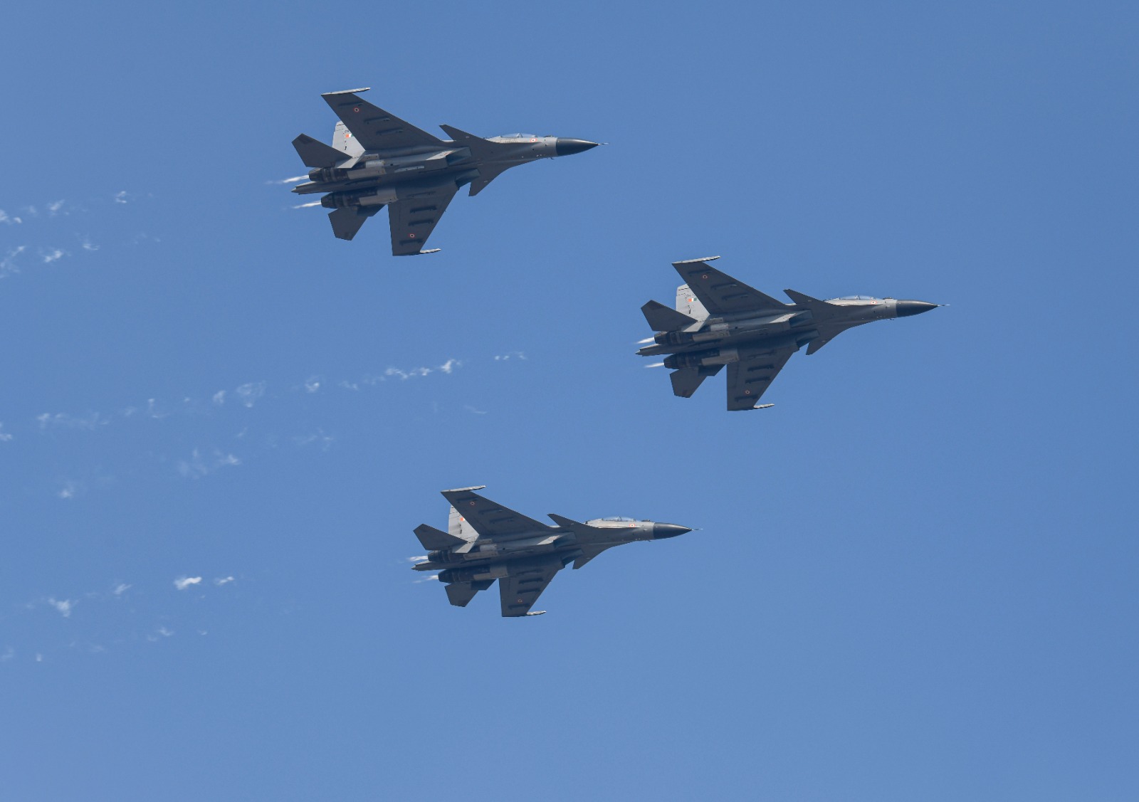 राफेल, सुखोई, जगुआर जैसे वायुसेना के विमानों ने आकाश में अपने हैरतअंगेज करतबों के जरिए दुश्मन को मजबूत संदेश देते हुए राष्ट्र की सीमाओं को जमीन से लेकर आसमान तक सुरक्षित रखने का मजबूत संदेश दिया।